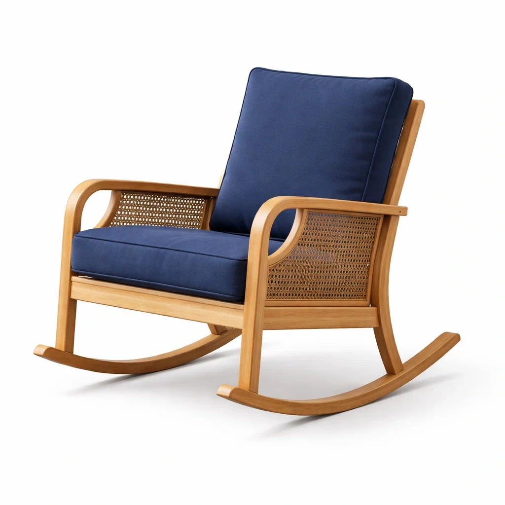 Matériaux: Structure en bois massif, dossier et accoudoirs en rotin, coussins en tissu polyester