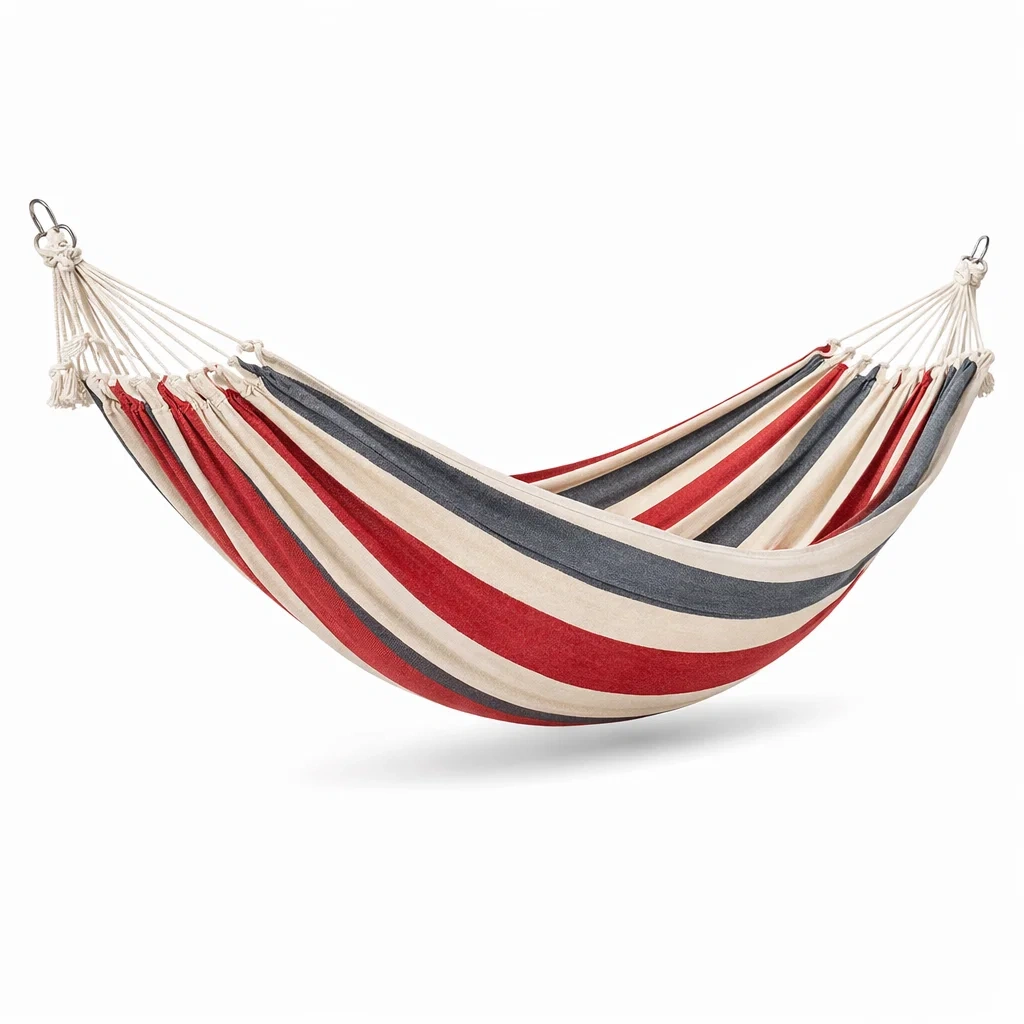 Ce hamac est fabriqué en toile de coton résistant et confortable, assurant une utilisation durable en extérieur. La capacité de charge maximale est de 200 kg.